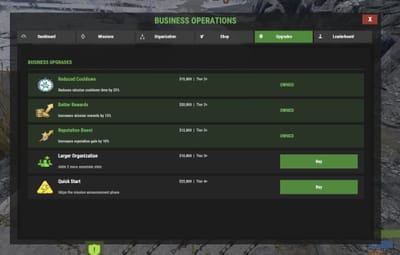 Reduced Cooldown Tier 2 $15,000 25% less wait between missions Better Rewards Tier 2 $20,000 +15% mission rewards Larger Organization Tier 3 $10,000 +2 associate slots Reputation Boost Tier 2 $12,000 +10% reputation gain Quick Start Tier 4 $25,000 skips the mission announcement phase