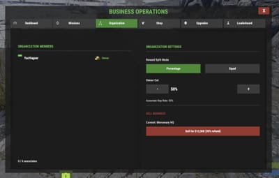The Organization tab is where you manage your team. View current associates, choose a reward split mode (percentage with a configurable owner cut, or equal), adjust the owner cut, and see the associate reputation earn rate.