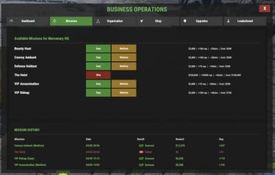 The Missions tab lists every mission you can run right now for your active business type. Each row shows the name, description, difficulty (Easy/Medium/Hard/Elite), start cost, estimated duration, base reward, reputation gain, eligibility, cooldown timer, and a launch button. There's also a history of your last 20 missions with results and bonuses earned.
