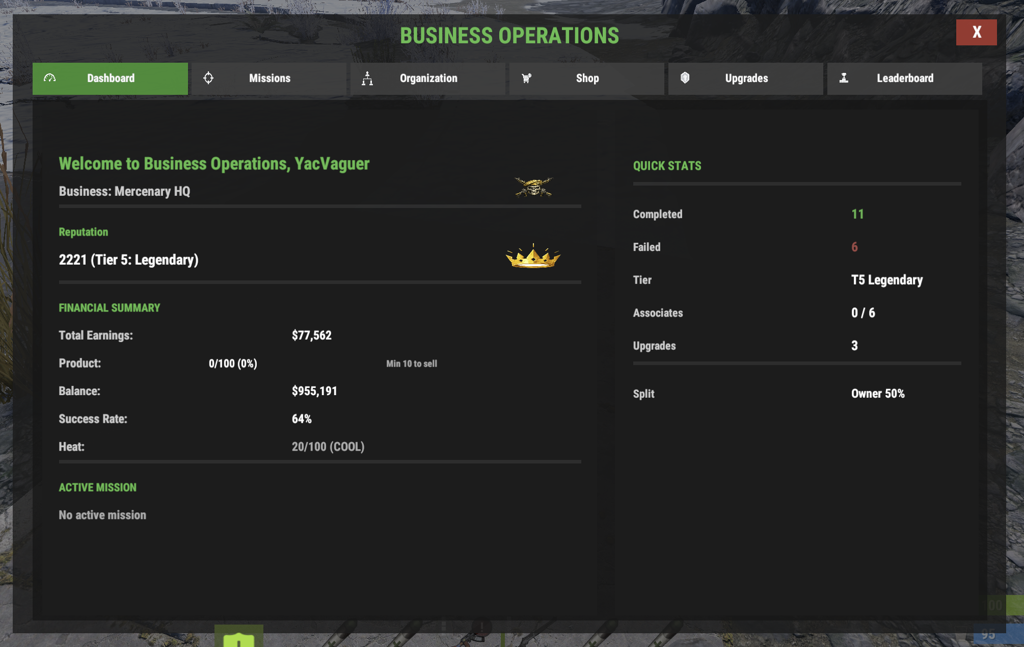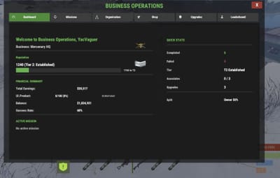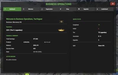 The Dashboard shows your business at a glance: office status, current tier, missions completed and failed, success rate, total earnings, current balance, active mission timer, active upgrades, product inventory, and your heat level if you've turned the Heat System on.