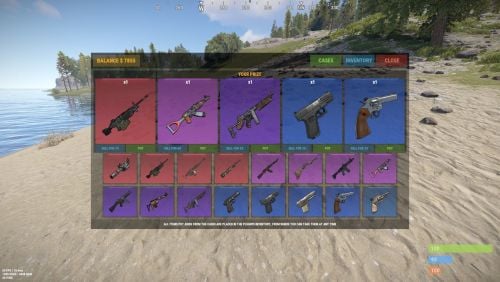 { "Should I use the item issue limit?": false, "Setting up privileges for the item issue limit": { "casesystem.default": 5, "casesystem.vip": 7 }, "Economics Plugin(1 - Economics, 2 - Server Rewards, 3 - IQEconomic, 4 - Bank System, 5-Cases)": 5, "Color adjustment(chance-color)": { "15": "0.8352942 0.3607843 0.4039216 1", "40": "0.7450981 0.3921569 0.8156863 1", "60": "0.5058824 0.3137255 0.8235295 1", "80": "0.2588235 0.4588236 0.8470589 1", "100": "0.3215686 0.5058824 0.7215686 1" }, "List of awards": [ { "Item ID (Indicated in the list of items in the case)": "1", "Shortname": "minigun", "Amount": 1, "Drop chance": 2, "Name the item": "", "Price the item": 100, "URL image the item": "https://rustlabs.com/img/items180/minigun.png", "SkinID ": 0, "Console command": "" }, { "Item ID (Indicated in the list of items in the case)": "2", "Shortname": "lmg.m249", "Amount": 1, "Drop chance": 5, "Name the item": "", "Price the item": 75, "URL image the item": "https://rustlabs.com/img/items180/lmg.m249.png", "SkinID ": 0, "Console command": "" }, { "Item ID (Indicated in the list of items in the case)": "3", "Shortname": "hmlmg", "Amount": 1, "Drop chance": 10, "Name the item": "", "Price the item": 60, "URL image the item": "https://rustlabs.com/img/items180/hmlmg.png", "SkinID ": 0, "Console command": "" }, { "Item ID (Indicated in the list of items in the case)": "4", "Shortname": "rifle.l96", "Amount": 1, "Drop chance": 15, "Name the item": "", "Price the item": 50, "URL image the item": "https://rustlabs.com/img/items180/rifle.l96.png", "SkinID ": 0, "Console command": "" }, { "Item ID (Indicated in the list of items in the case)": "5", "Shortname": "rifle.lr300", "Amount": 1, "Drop chance": 35, "Name the item": "", "Price the item": 40, "URL image the item": "https://rustlabs.com/img/items180/rifle.lr300.png", "SkinID ": 0, "Console command": "" }, { "Item ID (Indicated in the list of items in the case)": "6", "Shortname": "rifle.ak", "Amount": 1, "Drop chance": 35, "Name the item": "", "Price the item": 40, "URL image the item": "https://rustlabs.com/img/items180/rifle.ak.png", "SkinID ": 0, "Console command": "" }, { "Item ID (Indicated in the list of items in the case)": "7", "Shortname": "rifle.sks", "Amount": 1, "Drop chance": 30, "Name the item": "", "Price the item": 50, "URL image the item": "https://rustlabs.com/img/items180/rifle.sks.png", "SkinID ": 0, "Console command": "" }, { "Item ID (Indicated in the list of items in the case)": "8", "Shortname": "rifle.bolt", "Amount": 1, "Drop chance": 30, "Name the item": "", "Price the item": 40, "URL image the item": "https://rustlabs.com/img/items180/rifle.bolt.png", "SkinID ": 0, "Console command": "" }, { "Item ID (Indicated in the list of items in the case)": "9", "Shortname": "smg.mp5", "Amount": 1, "Drop chance": 50, "Name the item": "", "Price the item": 30, "URL image the item": "https://rustlabs.com/img/items180/smg.mp5.png", "SkinID ": 0, "Console command": "" }, { "Item ID (Indicated in the list of items in the case)": "10", "Shortname": "rifle.semiauto", "Amount": 1, "Drop chance": 55, "Name the item": "", "Price the item": 20, "URL image the item": "https://rustlabs.com/img/items180/rifle.semiauto.png", "SkinID ": 0, "Console command": "" }, { "Item ID (Indicated in the list of items in the case)": "11", "Shortname": "smg.thompson", "Amount": 1, "Drop chance": 60, "Name the item": "", "Price the item": 25, "URL image the item": "https://rustlabs.com/img/items180/smg.thompson.png", "SkinID ": 0, "Console command": "" }, { "Item ID (Indicated in the list of items in the case)": "12", "Shortname": "pistol.m92", "Amount": 1, "Drop chance": 70, "Name the item": "", "Price the item": 20, "URL image the item": "https://rustlabs.com/img/items180/pistol.m92.png", "SkinID ": 0, "Console command": "" }, { "Item ID (Indicated in the list of items in the case)": "13", "Shortname": "pistol.prototype17", "Amount": 1, "Drop chance": 70, "Name the item": "", "Price the item": 30, "URL image the item": "https://rustlabs.com/img/items180/pistol.prototype17.png", "SkinID ": 0, "Console command": "" }, { "Item ID (Indicated in the list of items in the case)": "14", "Shortname": "pistol.semiauto", "Amount": 1, "Drop chance": 75, "Name the item": "", "Price the item": 15, "URL image the item": "https://rustlabs.com/img/items180/pistol.semiauto.png", "SkinID ": 0, "Console command": "" }, { "Item ID (Indicated in the list of items in the case)": "15", "Shortname": "pistol.python", "Amount": 1, "Drop chance": 80, "Name the item": "", "Price the item": 20, "URL image the item": "https://rustlabs.com/img/items180/pistol.python.png", "SkinID ": 0, "Console command": "" }, { "Item ID (Indicated in the list of items in the case)": "16", "Shortname": "pistol.revolver", "Amount": 1, "Drop chance": 95, "Name the item": "", "Price the item": 5, "URL image the item": "https://rustlabs.com/img/items180/pistol.revolver.png", "SkinID ": 0, "Console command": "" }, { "Item ID (Indicated in the list of items in the case)": "17", "Shortname": "electric.generator.small", "Amount": 1, "Drop chance": 5, "Name the item": "", "Price the item": 150, "URL image the item": "https://rustlabs.com/img/items180/electric.generator.small.png", "SkinID ": 0, "Console command": "" }, { "Item ID (Indicated in the list of items in the case)": "18", "Shortname": "workbench3", "Amount": 1, "Drop chance": 10, "Name the item": "", "Price the item": 35, "URL image the item": "https://rustlabs.com/img/items180/workbench3.png", "SkinID ": 0, "Console command": "" }, { "Item ID (Indicated in the list of items in the case)": "19", "Shortname": "workbench2", "Amount": 1, "Drop chance": 10, "Name the item": "", "Price the item": 30, "URL image the item": "https://rustlabs.com/img/items180/workbench2.png", "SkinID ": 0, "Console command": "" }, { "Item ID (Indicated in the list of items in the case)": "20", "Shortname": "autoturret", "Amount": 1, "Drop chance": 15, "Name the item": "", "Pric