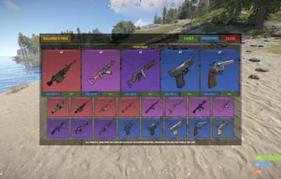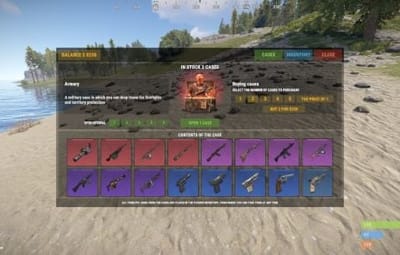 { "Should I use the item issue limit?": false, "Setting up privileges for the item issue limit": { "casesystem.default": 5, "casesystem.vip": 7 }, "Economics Plugin(1 - Economics, 2 - Server Rewards, 3 - IQEconomic, 4 - Bank System, 5-Cases)": 5, "Color adjustment(chance-color)": { "15": "0.8352942 0.3607843 0.4039216 1", "40": "0.7450981 0.3921569 0.8156863 1", "60": "0.5058824 0.3137255 0.8235295 1", "80": "0.2588235 0.4588236 0.8470589 1", "100": "0.3215686 0.5058824 0.7215686 1" }, "List of awards": [ { "Item ID (Indicated in the list of items in the case)": "1", "Shortname": "minigun", "Amount": 1, "Drop chance": 2, "Name the item": "", "Price the item": 100, "URL image the item": "https://rustlabs.com/img/items180/minigun.png", "SkinID ": 0, "Console command": "" }, { "Item ID (Indicated in the list of items in the case)": "2", "Shortname": "lmg.m249", "Amount": 1, "Drop chance": 5, "Name the item": "", "Price the item": 75, "URL image the item": "https://rustlabs.com/img/items180/lmg.m249.png", "SkinID ": 0, "Console command": "" }, { "Item ID (Indicated in the list of items in the case)": "3", "Shortname": "hmlmg", "Amount": 1, "Drop chance": 10, "Name the item": "", "Price the item": 60, "URL image the item": "https://rustlabs.com/img/items180/hmlmg.png", "SkinID ": 0, "Console command": "" }, { "Item ID (Indicated in the list of items in the case)": "4", "Shortname": "rifle.l96", "Amount": 1, "Drop chance": 15, "Name the item": "", "Price the item": 50, "URL image the item": "https://rustlabs.com/img/items180/rifle.l96.png", "SkinID ": 0, "Console command": "" }, { "Item ID (Indicated in the list of items in the case)": "5", "Shortname": "rifle.lr300", "Amount": 1, "Drop chance": 35, "Name the item": "", "Price the item": 40, "URL image the item": "https://rustlabs.com/img/items180/rifle.lr300.png", "SkinID ": 0, "Console command": "" }, { "Item ID (Indicated in the list of items in the case)": "6", "Shortname": "rifle.ak", "Amount": 1, "Drop chance": 35, "Name the item": "", "Price the item": 40, "URL image the item": "https://rustlabs.com/img/items180/rifle.ak.png", "SkinID ": 0, "Console command": "" }, { "Item ID (Indicated in the list of items in the case)": "7", "Shortname": "rifle.sks", "Amount": 1, "Drop chance": 30, "Name the item": "", "Price the item": 50, "URL image the item": "https://rustlabs.com/img/items180/rifle.sks.png", "SkinID ": 0, "Console command": "" }, { "Item ID (Indicated in the list of items in the case)": "8", "Shortname": "rifle.bolt", "Amount": 1, "Drop chance": 30, "Name the item": "", "Price the item": 40, "URL image the item": "https://rustlabs.com/img/items180/rifle.bolt.png", "SkinID ": 0, "Console command": "" }, { "Item ID (Indicated in the list of items in the case)": "9", "Shortname": "smg.mp5", "Amount": 1, "Drop chance": 50, "Name the item": "", "Price the item": 30, "URL image the item": "https://rustlabs.com/img/items180/smg.mp5.png", "SkinID ": 0, "Console command": "" }, { "Item ID (Indicated in the list of items in the case)": "10", "Shortname": "rifle.semiauto", "Amount": 1, "Drop chance": 55, "Name the item": "", "Price the item": 20, "URL image the item": "https://rustlabs.com/img/items180/rifle.semiauto.png", "SkinID ": 0, "Console command": "" }, { "Item ID (Indicated in the list of items in the case)": "11", "Shortname": "smg.thompson", "Amount": 1, "Drop chance": 60, "Name the item": "", "Price the item": 25, "URL image the item": "https://rustlabs.com/img/items180/smg.thompson.png", "SkinID ": 0, "Console command": "" }, { "Item ID (Indicated in the list of items in the case)": "12", "Shortname": "pistol.m92", "Amount": 1, "Drop chance": 70, "Name the item": "", "Price the item": 20, "URL image the item": "https://rustlabs.com/img/items180/pistol.m92.png", "SkinID ": 0, "Console command": "" }, { "Item ID (Indicated in the list of items in the case)": "13", "Shortname": "pistol.prototype17", "Amount": 1, "Drop chance": 70, "Name the item": "", "Price the item": 30, "URL image the item": "https://rustlabs.com/img/items180/pistol.prototype17.png", "SkinID ": 0, "Console command": "" }, { "Item ID (Indicated in the list of items in the case)": "14", "Shortname": "pistol.semiauto", "Amount": 1, "Drop chance": 75, "Name the item": "", "Price the item": 15, "URL image the item": "https://rustlabs.com/img/items180/pistol.semiauto.png", "SkinID ": 0, "Console command": "" }, { "Item ID (Indicated in the list of items in the case)": "15", "Shortname": "pistol.python", "Amount": 1, "Drop chance": 80, "Name the item": "", "Price the item": 20, "URL image the item": "https://rustlabs.com/img/items180/pistol.python.png", "SkinID ": 0, "Console command": "" }, { "Item ID (Indicated in the list of items in the case)": "16", "Shortname": "pistol.revolver", "Amount": 1, "Drop chance": 95, "Name the item": "", "Price the item": 5, "URL image the item": "https://rustlabs.com/img/items180/pistol.revolver.png", "SkinID ": 0, "Console command": "" }, { "Item ID (Indicated in the list of items in the case)": "17", "Shortname": "electric.generator.small", "Amount": 1, "Drop chance": 5, "Name the item": "", "Price the item": 150, "URL image the item": "https://rustlabs.com/img/items180/electric.generator.small.png", "SkinID ": 0, "Console command": "" }, { "Item ID (Indicated in the list of items in the case)": "18", "Shortname": "workbench3", "Amount": 1, "Drop chance": 10, "Name the item": "", "Price the item": 35, "URL image the item": "https://rustlabs.com/img/items180/workbench3.png", "SkinID ": 0, "Console command": "" }, { "Item ID (Indicated in the list of items in the case)": "19", "Shortname": "workbench2", "Amount": 1, "Drop chance": 10, "Name the item": "", "Price the item": 30, "URL image the item": "https://rustlabs.com/img/items180/workbench2.png", "SkinID ": 0, "Console command": "" }, { "Item ID (Indicated in the list of items in the case)": "20", "Shortname": "autoturret", "Amount": 1, "Drop chance": 15, "Name the item": "", "Pric