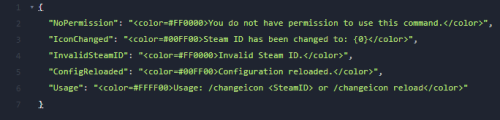{ "NoPermission": "<color=#FF0000>You do not have permission to use this command.</color>", "IconChanged": "<color=#00FF00>Steam ID has been changed to: {0}</color>", "InvalidSteamID": "<color=#FF0000>Invalid Steam ID.</color>", "ConfigReloaded": "<color=#00FF00>Configuration reloaded.</color>", "Usage": "<color=#FFFF00>Usage: /changeicon <SteamID> or /changeicon reload</color>" }
