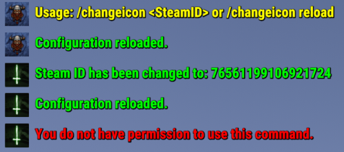 /changeicon <SteamID>: Sets the new SteamID as the icon for system messages. Uses permission "changeicon.admin” /changeicon reload: Reloads the configuration file. Uses permission "changeicon.admin”