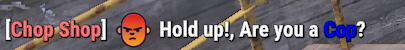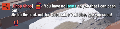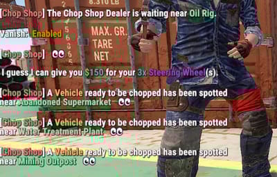 /SPAWNCHOPDEALER – Requires Admin Permission – Will spawn a CHOP SHOP NPC in your Position. (ONLY IF NPC DYNAMIC SPAWN IS FALSE!!!)