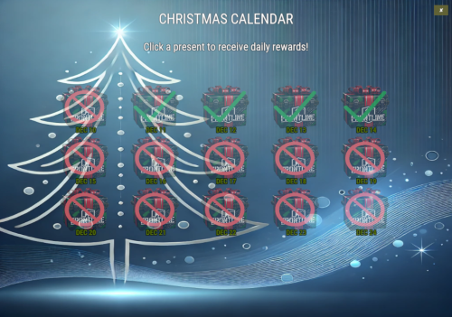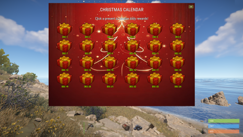 Allow players to claim daily Christmas Calendar presents during December. Fully configurable loot table and UI.