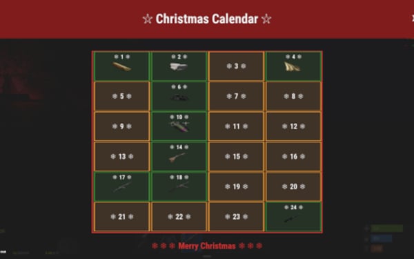 { "ChristmasItems": { "1": { "amount": 1000, "canClaimLater": true, "itemName": "pants", "skinId": 2834845594 }, "2": { "amount": 1000, "canClaimLater": false, "itemName": "stones", "skinId": 0 }, "3": { "amount": 500, "canClaimLater": false, "itemName": "metal.fragments", "skinId": 0 }, "4": { "amount": 250, "canClaimLater": true, "itemName": "cloth", "skinId": 0 }, //5-24 doors same principle }, "Command": "openac" }