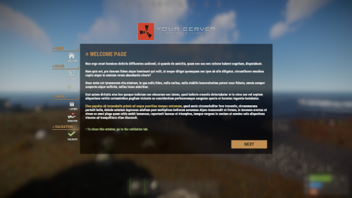 { "1. CONFIG": { " » Show panel once?": false, " » Command chat": "info" }, "2. LOGO": { " » Enabled?": true, " » Logo URL": "https://cdn.discordapp.com/attachments/668151580964552721/808704749637599292/logo.png", " » Offset Min": "-150 5", " » Offset Max": "150 85" }, "3. CLOSE": { " » Display close button only on the last page?": true, " » Close BTN Text": "I certify that I have read the rules", " » Offset Min": "-180 20", " » Offset Max": "180 50", " » Font Size": 16 }, "4. PREV": { " » Text": "Previous", " » Offset Min": "-50 20", " » Offset Max": "80 50", " » Font Size": 16 }, "5. NEXT": { " » Text": "Next", " » Offset Min": "200 20", " » Offset Max": "330 50", " » Font Size": 16 }, "6. CATEGORY": [ { " » Unique id": 1, " » Title": "» Home" }, { " » Unique id": 2, " » Title": "» Rules" }, { " » Unique id": 3, " » Title": "» Infos" }, { " » Unique id": 4, " » Title": "» Validation" } ], "7. PANEL": [ { " » Menu Icon": "https://i49.servimg.com/u/f49/14/08/21/53/homev210.png", " » Menu Perm": "", " » Menu Category": 1, " » Language": { "en": { " » Menu Title": "Welcome", " » Menu Text": [ { " » New page": [ "<size=20><color=#bf8e51><size=26> »</size> WELCOME PAGE</color></size>\n", "Non ergo erunt homines deliciis diffluentes audiendi, si quando de amicitia, quam nec usu nec ratione habent cognitam, disputabunt.\n", "Nam quis est, pro deorum fidem atque hominum! qui velit, ut neque diligat quemquam nec ipse ab ullo diligatur, circumfluere omnibus copiis atque in omnium rerum abundantia vivere?\n", "Haec enim est tyrannorum vita nimirum, in qua nulla fides, nulla caritas, nulla stabilis benevolentiae potest esse fiducia, omnia semper suspecta atque sollicita, nullus locus amicitiae.\n", "Erat autem diritatis eius hoc quoque indicium nec obscurum nec latens, quod ludicris cruentis delectabatur et in circo sex vel septem aliquotiens vetitis certaminibus pugilum vicissim se concidentium perfusorumque sanguine specie ut lucratus ingentia laetabatur.\n", "<color=#dcc16d>Eius populus ab incunabulis primis ad usque pueritiae tempus extremum</color>, quod annis circumcluditur fere trecentis, circummurana pertulit bella, deinde aetatem ingressus adultam post multiplices bellorum aerumnas Alpes transcendit et fretum, in iuvenem erectus et virum ex omni plaga quam orbis ambit inmensus, reportavit laureas et triumphos, iamque vergens in senium et nomine solo aliquotiens vincens ad tranquilliora vitae discessit.\n\n", "<size=12><color=#aabf7d>• To close this window, go to the validation tab.</color></size>" ] }, { " » New page": [ "Page 2" ] } ] } } }, { " » Menu Icon": "https://i49.servimg.com/u/f49/14/08/21/53/rules10.png", " » Menu Perm": "", " » Menu Category": 2, " » Language": { "en": { " » Menu Title": "General", " » Menu Text": [ { " » New page": [ "<size=20><color=#bf8e51><size=26> »</size> GENERAL PAGE</color></size>\n", "Non ergo erunt homines deliciis diffluentes audiendi, si quando de amicitia, quam nec usu nec ratione habent cognitam, disputabunt.\n", "Nam quis est, pro deorum fidem atque hominum! qui velit, ut neque diligat quemquam nec ipse ab ullo diligatur, circumfluere omnibus copiis atque in omnium rerum abundantia vivere?\n", "Haec enim est tyrannorum vita nimirum, in qua nulla fides, nulla caritas, nulla stabilis benevolentiae potest esse fiducia, omnia semper suspecta atque sollicita, nullus locus amicitiae.\n", "Erat autem diritatis eius hoc quoque indicium nec obscurum nec latens, quod ludicris cruentis delectabatur et in circo sex vel septem aliquotiens vetitis certaminibus pugilum vicissim se concidentium perfusorumque sanguine specie ut lucratus ingentia laetabatur.\n", "<color=#dcc16d>Eius populus ab incunabulis primis ad usque pueritiae tempus extremum</color>, quod annis circumcluditur fere trecentis, circummurana pertulit bella, deinde aetatem ingressus adultam post multiplices bellorum aerumnas Alpes transcendit et fretum, in iuvenem erectus et virum ex omni plaga quam orbis ambit inmensus, reportavit laureas et triumphos, iamque vergens in senium et nomine solo aliquotiens vincens ad tranquilliora vitae discessit.\n\n", "<size=12><color=#aabf7d>• To close this window, go to the validation tab.</color></size>" ] }, { " » New page": [ "Page 2" ] } ] } } }, { " » Menu Icon": "https://i.servimg.com/u/f49/14/08/21/53/annexe14.png", " » Menu Perm": "", " » Menu Category": 2, " » Language": { "en": { " » Menu Title": "Annex", " » Menu Text": [ { " » New page": [ "<size=20><color=#bf8e51><size=26> »</size> ANNEX PAGE</color></size>\n", "Non ergo erunt homines deliciis diffluentes audiendi, si quando de amicitia, quam nec usu nec ratione habent cognitam, disputabunt.\n", "Nam quis est, pro deorum fidem atque hominum! qui velit, ut neque diligat quemquam nec ipse ab ullo diligatur, circumfluere omnibus copiis atque in omnium rerum abundantia vivere?\n", "Haec enim est tyrannorum vita nimirum, in qua nulla fides, nulla caritas, nulla stabilis benevolentiae potest esse fiducia, omnia semper suspecta atque sollicita, nullus locus amicitiae.\n", "Erat autem diritatis eius hoc quoque indicium nec obscurum nec latens, quod ludicris cruentis delectabatur et in circo sex vel septem aliquotiens vetitis certaminibus pugilum vicissim se concidentium perfusorumque sanguine specie ut lucratus ingentia laetabatur.\n", "<color=#dcc16d>Eius populus ab incunabulis primis ad usque pueritiae tempus extremum</color>, quod annis circumcluditur fere trecentis, circummurana pertulit bella, deinde aetatem ingressus adultam post multiplices bellorum aerumnas Alpes transcendit et fretum, in iuvenem erectus et virum ex omni plaga quam orbis ambit inmensus, reportavit laureas et triumphos, iamque vergens in senium et nomine solo aliquotiens vincens ad tranquilliora vitae discessit.\n\n", "<size=12><color=#aabf7d>• To close this window, go to the validation tab.</color></size>" ] }, { " » New page": [ "Page 2" ] } ] } } }, { " » Menu Icon":