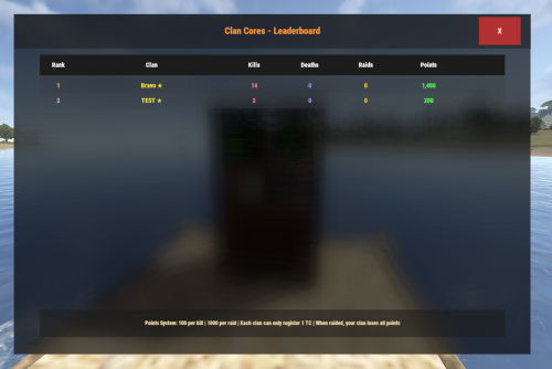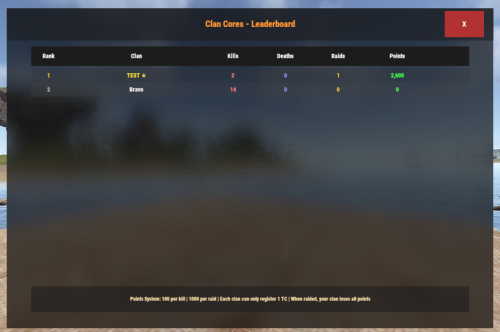 - PointsPerRaid: Base points awarded for raiding a clan's TC (added to stolen points)
