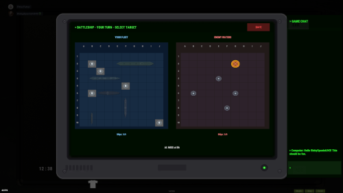 The classic naval combat game. Strategically place your fleet of 5 ships, then take turns firing at your opponent's grid to locate and sink their ships. First to sink all enemy ships wins! Features ship placement with rotation, hit/miss markers, and ship status tracking. CPU uses intelligent hunt-and-destroy targeting.