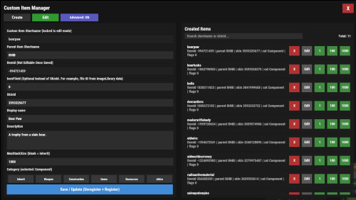 Custom Item Manager is an in-game admin UI for creating true custom Rust items by registering brand-new ItemDefinitions, leveraging the CustomItemDefinitions* framework. Unlike traditional “skinned item” approaches, this plugin adds items directly into the game’s item manifest, allowing them to be spawned, stored, traded, and in many cases interacted with exactly like vanilla items.