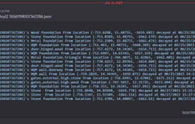 Efficient Logging: Optimized data storage through an efficient caching system. Stores logs in memory and seamlessly writes them to disk in JSON format when the plugin unloads or the predetermined cache limit is reached. This intelligent approach guarantees minimal performance impact, allowing you to maintain a comprehensive record of decayed entities, regardless of whether your server has 5 players or 500.