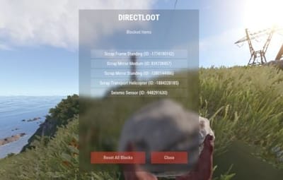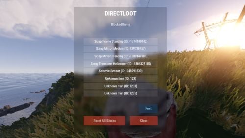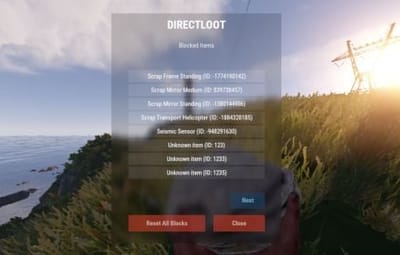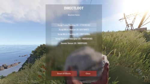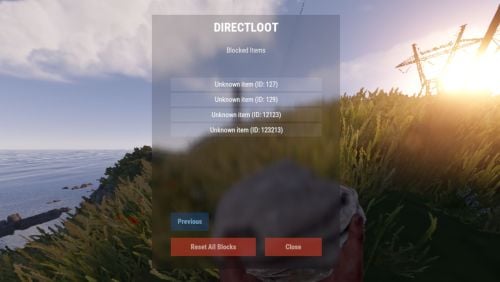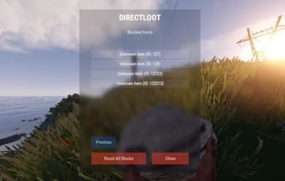 With the latest update, DirectLoot introduces advanced customization options for players, allowing them to block specific items from being automatically added to their inventory. A visually interactive menu (CUI) has been added, enabling players to manage their blocked items easily, view lists, or reset preferences—all tailored to provide a more personalized and engaging looting experience.