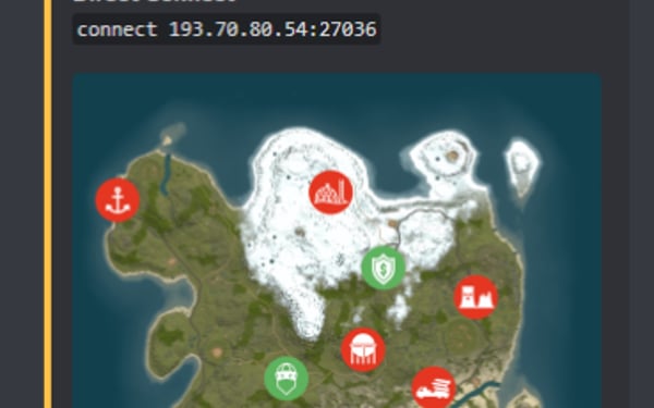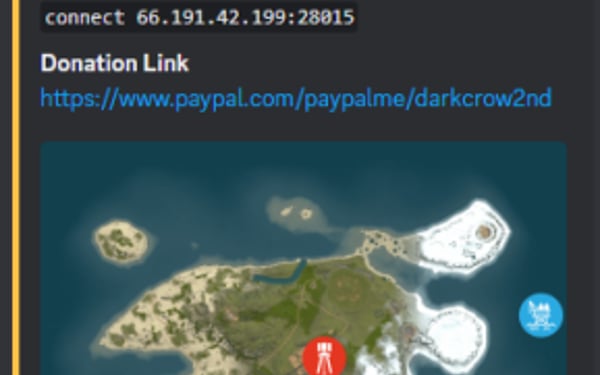{ "Sets Console Command": "sendwipe", "Disable Auto Send (Requires you to manually use console command to send embed message)": false, "ConnectionInfo": { "DiscordWebhookURL": "", "ServerName": "[US] -10X No BPs [KITS/TP/PVP]", "RustServerIp": "", "DonationURL": "", "EnableStaging": false, "EnableBarren": false, "RustMapsApiKey": "" }, "ForceWipe": { "AtEveryone": false, "AtRoleID": "", "EmbedHexColour": "#ffc348", "This will replace the Map Image if used": "", "This will generate the Map Image if enabled": false }, "Manually": { "AtEveryone": false, "AtRoleID": "", "EmbedHexColour": "#ffc348", "This will replace the Map Image if used": "", "This will generate the Map Image if enabled": false }, "Embed Fields & Descriptions": { "Map": { "Enabled": true, "Description": "", "Inline": false }, "Seed": { "Enabled": true, "Description": "", "Inline": true }, "World Size": { "Enabled": true, "Description": "", "Inline": true }, "Protocol": { "Enabled": true, "Description": "", "Inline": true }, "Direct Connect": { "Enabled": true, "Description": "", "Inline": false }, "Donation Link": { "Enabled": true, "Description": "", "Inline": false } }, "Sets Server Commands to run after wipe": [], "Do not touch.": { "WipedTime": "Thursday, 13 November 2025 17:29", "LastWipe": "Thursday, 13 November 2025 17:29" } }