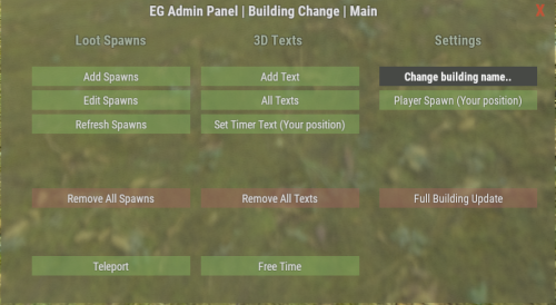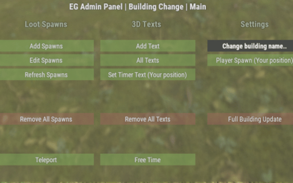 /aeg - Call the admin menu (requires administrator rights) /eg - Call the player's menu