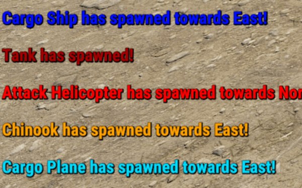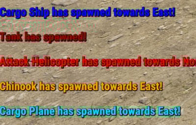 The plugin adds messages in the main chat when a Chinook, CargoShip, CargoPlane, Attack Helicopter, Tank event occurs.