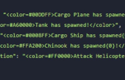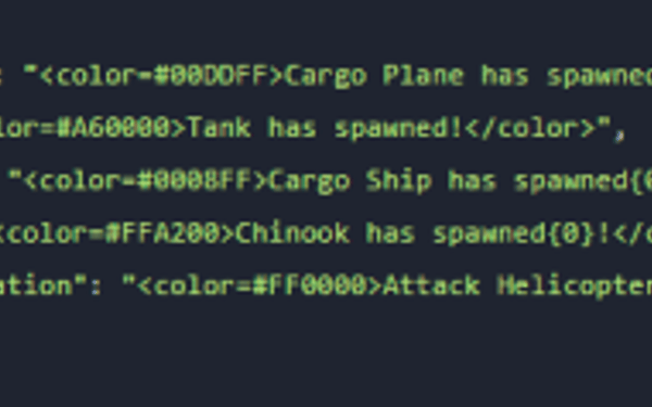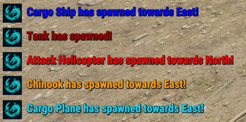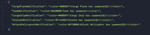 { "CargoPlaneNotification": "<color=#00DDFF>Cargo Plane has spawned{0}!</color>", "TankNotification": "<color=#A60000>Tank has spawned!</color>", "CargoShipNotification": "<color=#0008FF>Cargo Ship has spawned{0}!</color>", "ChinookNotification": "<color=#FFA200>Chinook has spawned{0}!</color>", "AttackHelicopterNotification": "<color=#FF0000>Attack Helicopter has spawned{0}!</color>" }