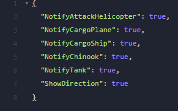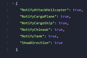 { "NotifyAttackHelicopter": true, "NotifyCargoPlane": true, "NotifyCargoShip": true, "NotifyChinook": true, "NotifyTank": true, "ShowDirection": true }