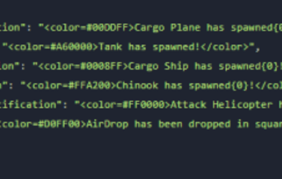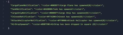 { "CargoPlaneNotification": "<color=#00DDFF>Cargo Plane has spawned{0}!</color>", "TankNotification": "<color=#A60000>Tank has spawned!</color>", "CargoShipNotification": "<color=#0008FF>Cargo Ship has spawned{0}!</color>", "ChinookNotification": "<color=#FFA200>Chinook has spawned{0}!</color>", "AttackHelicopterNotification": "<color=#FF0000>Attack Helicopter has spawned{0}!</color>", "AirDropSpawned": "<color=#D0FF00>AirDrop has been dropped in square {0}!</color>" }