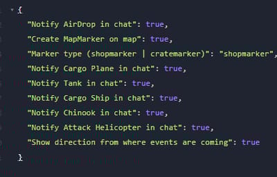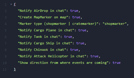 { "Notify AirDrop in chat": true, "Create MapMarker on map": true, "Marker type (shopmarker | cratemarker)": "shopmarker", "Notify Cargo Plane in chat": true, "Notify Tank in chat": true, "Notify Cargo Ship in chat": true, "Notify Chinook in chat": true, "Notify Attack Helicopter in chat": true, "Show direction from where events are coming": true }