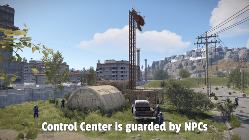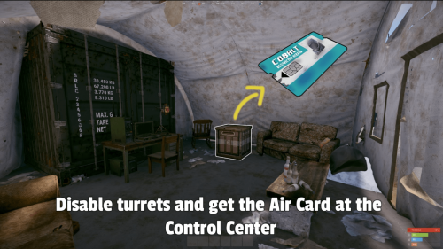 The Control Center spawns at a random monument and is guarded by NPCs. There is a button inside to disable the turrets on the flying cargo ship. An Air Card can also be found there, granting you access to the lower deck of the cargo ship.