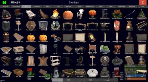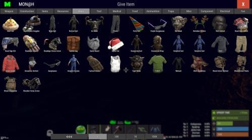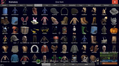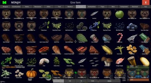 Quote{ "Error.Dead": "Giving items not allowed when dead!", "Error.Failed": "Failed to give item!", "Error.LimitCategory": "You have reached the limit of {0} items in this category! Cooldown: {1}", "Error.LimitItem": "You have reached the limit of {0} items of this type! Cooldown: {1}", "Error.LimitTotal": "You have reached the limit of {0} total items! Cooldown: {1}", "Error.NoPermission": "You do not have permission to use this command!", "Error.PlayerNotFound": "Player <color=#FFA500>{0}</color> not found!", "Format.Day": "day", "Format.Days": "days", "Format.DiscordEmoji": ":palm_down_hand:", "Format.DiscordMessage": "{0} <t:{1}:t> `{2}` **`{3}`** gave to `{4}` **`{5}`** `{6}` x{7}", "Format.Hour": "hour", "Format.Hours": "hours", "Format.LogMessage": "{0} {1} gave to {2} {3} {4} x{5}", "Format.Minute": "minute", "Format.Minutes": "minutes", "Format.Prefix": "<color=#00FF00>[Give Item]</color>: ", "Format.Second": "second", "Format.Seconds": "seconds", "Format.Title": "Give Item", "Format.ItemCategory.Medical": "Medical", "Format.ItemCategory.Items": "Items", "Format.ItemCategory.Attire": "Attire", "Format.ItemCategory.Tool": "Tool", "Format.ItemCategory.Food": "Food", "Format.ItemCategory.Misc": "Misc", "Format.ItemCategory.Fun": "Fun", "Format.ItemCategory.Weapon": "Weapon", "Format.ItemCategory.Construction": "Construction", "Format.ItemCategory.Resources": "Resources", "Format.ItemCategory.Ammunition": "Ammunition", "Format.ItemCategory.Traps": "Traps", "Format.ItemCategory.Component": "Component", "Format.ItemCategory.Electrical": "Electrical" }