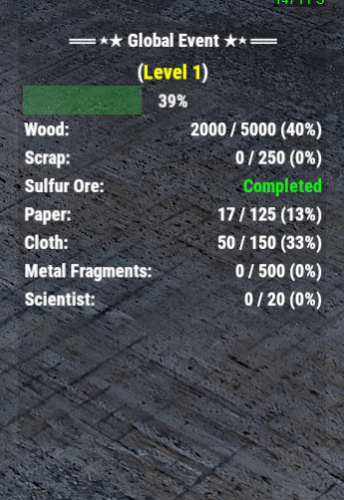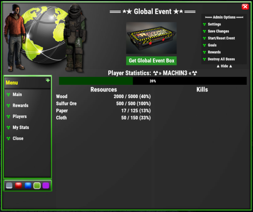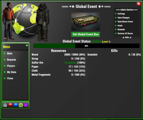 Global Event plugins allows you to create custom goals for players to achieve like gathering resources or items and kill specific entities. Each player that contributes towards the event will receive the rewards you list. Comes with HUD UI and interactive UI (preview below) for players to view details about the event, goals, rewards, and more..
