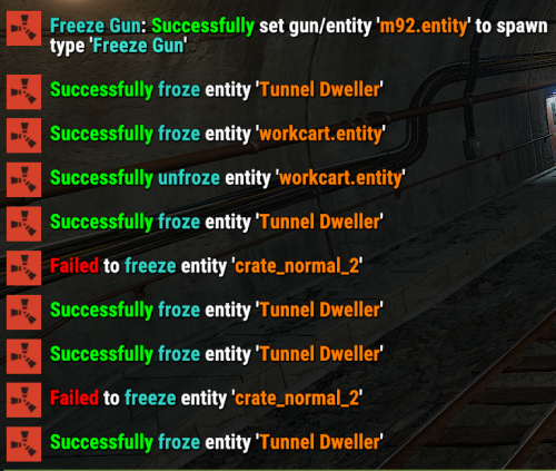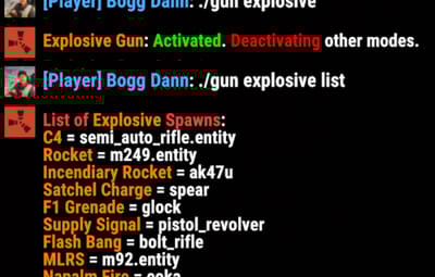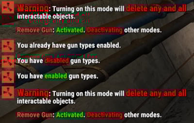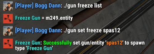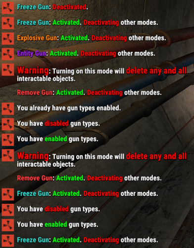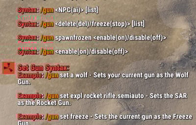 Note: Turning on any of the gun modes via their direct name (i.e: animal, entity, etc.) will also effectively do `/gun on` for you. /gun off - Disables gun mode in general to prevent use of any of the types below. /gun on - Activates gun mode in general to allow use of any of the types below. /gun animal - Activates animal gun mode. /gun explosive - Activates explosive gun mode. /gun entity - Activates animal gun mode. /gun freeze - Activates animal gun mode. /gun remove - Activates animal gun mode. Use Shortnames to change the gun type, or their defining part of their name. EX: for "pistol_revolver", do "revolver". /gun set animal wolf - Sets your current held gun to the wolf gun. /gun set explosive mlrs m249 - Sets the M249 to the MLRS gun. /gun set freeze - Sets your current held gun to the freeze gun. (only 1 freeze type so no type specification required) /gun set remove pistol_revolver - Sets revolver to the remove gun. (only 1 remove type so no type specification required) /gun spawnfrozen on - Sets NPCs and Animals to spawn frozen. /gun spawn frozen on - Sets NPCs and Animals to spawn frozen. Lots of QoL allowances for freeze AoE commands. /gun set freeze aoe on - Sets freeze AoE (radius) on. /gun freeze aoe on - Sets freeze AoE (radius) on. /gun set freeze aoe 12 - Sets freeze AoE (radius) to 12m. /gun freeze aoe 12 - Sets freeze AoE (radius) to 12m.