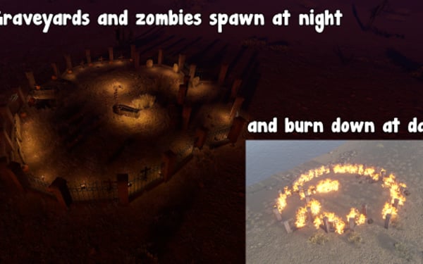 The plugin comes with one graveyard built-in, you can also create custom grave yards. Graveyards spawn at night and are guarded by zombies. Inside you can find coffins with loot. They will burn down as soon as the sun rises.
