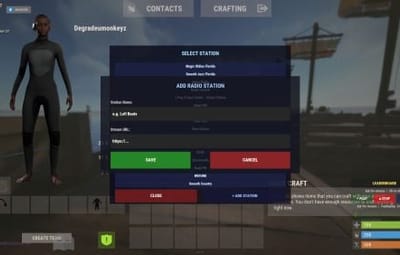 Admins with the headphones.admin permission can add new stations directly in-game via the + ADD STATION button inside the station picker. Stations are saved permanently server-wide and are immediately available to all players.