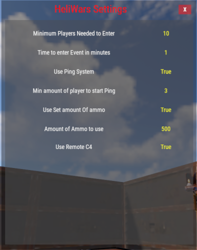 { "1. Event Settings": { "Auto Spawn Event (false will disable spawn commands)": true, "Min Players requered to start Event": 2, "Time to enter Event in minutes": 1, "Auto Spawn Timer Minimum (in minutes)": 120, "Auto Spawn Timer Maximum(in minutes)": 180, "Ping System - use on event players": true, "Ping System - min amount of players to start ping": 3, "List of Monuments to Exclude (Prefab Name ex. assets/bundled/prefabs/autospawn/monument/fishing_village/fishing_village_a.prefab or fishing_village)": [ "assets/bundled/prefabs/autospawn/monument/cave/cave_small_medium.prefab", "cave", "underwater", "bunker", "power_sub", "launch_site", "radtown", "tiny", "ice" ] }, "2. Heli Settings": { "Use Set amount of ammo (if false - ammo will refill on a player elimination)": true, "Start Ammo ammount": 500, "Use Remote controlled C4 (Detonate with Reload Button)": true }, "3. Prize Settings": { "Give Random Item in list (false will give all)": true, "Give Random Command in list (false will give all)": true, "All Custom Commands": [ "GiveRank {playerid} VIP", "GiveRank {playerid} VIP+" ], "All Prize Items": [ { "Item Amount": 2000, "Item Short Prefab Name": "scrap", "Item Skin ID (0 = Default)": 0, "Item Display Name (empty = Default)": "" } ], "Winner Prize : 0 None , 1 = Item , 2 = Customcommand , 3 = Item + Customcommand": 1 }, "4. External Plugin Settings": { "Chat commands to block in event": [ "shop", "shops", "tp", "tpa", "home" ], "Console commands to block in event": [ "god" ] }, "5 HeliWars Chat Commands": { "Chat command to start HeliWars": "heliwars", "Chat command to enter HeliWars": "jhw", "Chat command to leave HeliWars": "lhw", "Chat command to see HeliWars LearderBoard": "hwtop" }, "6. Debug Settings": { "Enable Debug? (enabled will start event without notify and no limit on entry)": false } }