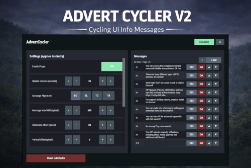 { "AdvertCycler": { "Enable Plugin": true, /Can disable globally from config if needed for whatever reason. "Update Interval (seconds)": 30, /How often the message should change "Message Alignment (BottomCenter/BottomLeft/TopCenter/TopRight)": "BottomLeft", /Base position where the messages should appear "Message Max Width (pixels)": 300, /Maximum line width for text. Anything beyond carries on new line "Vertical Offset (pixels)": 10, /Fine Up and Down adjustment of text position "Horizontal Offset (pixels)": 2, /Fine Left and Right adjustment of text position "Enable Text Outline": true, /Enable or disable text outline "Text Outline Color (HEX)": "#000000", /Color of text outline. Black by default. "Font Size (pixels)": 12, /Text font size "Display as Overlay": true, /Displaying the messages as overlay will allow them to be seen on top of other in game hud screens such as inventory "Randomize Messages": false, /Messages can be displayed at random "Message List": [ "For server info, type <color=#30FEDE>/info</color> in chat.", "There are many different types of PVE enemies. Be careful!" ] } }