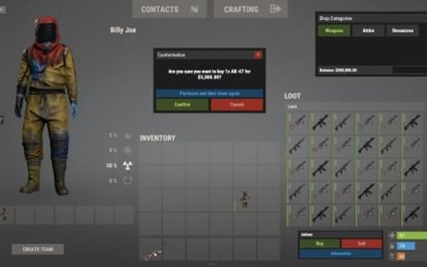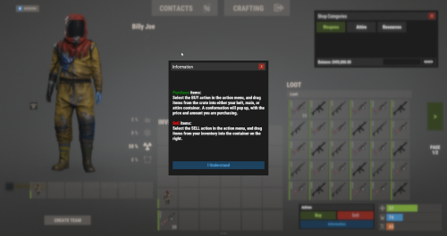 { "CannotDragOnItem": "You can not drag onto a slot with a item already in it.", "PurchaseSuccessful": "You have successfully purchased {0}x {1} for {2}.", "ErrorStacking": "You would be exceeding the max stack size of that item, please drag into another slot.", "ErrorPurchase": "There was an error purchasing this item, please try again.", "CannotAfford": "You can not afford this item with the selected amount.", "ItemCantBeSold": "This item is not able to be sold.", "SoldItem": "You have sold {0}x {1} for {2}.", "ErrorSelling": "There was an error selling this item, please try again.", "BuildingBlocked": "You cannot use this action when building blocked.", "CombatBlocked": "You cannot use this action when combat blocked.", "RaidBlocked": "You cannot use this action when raid blocked.", "InformationText": "<color=green>Purchase</color> items:\nSelect the BUY action in the action menu, and drag items from the crate into either your belt, main, or attire container. A conformation will pop up, with the price and amount you are purchasing.\n\n<color=red>Sell</color> items:\nSelect the SELL action in the action menu, and drag items from your inventory into the container on the right.", "NotEnoughAuto": "You did not have enough balance to auto purchase your kit.", "NoPermission": "You do not have permission to use this command.", "BuyTransactionLog": "{0} [{1}] has bought {3}x {2} for {4}.", "SellTransactionLog": "{0} [{1}] has sold {3}x {2} for {4}.", "ConformationText": "Conformation", "BuyConformationText": "Are you sure you want to buy {0}x {1} for {2}?", "SellConformationText": "Are you sure you want to sell {0}x {1} for {2}?", "ConfirmButton": "Confirm", "CancelButton": "Cancel", "NoConfBuyButton": "Purchase and dont show again", "NoConfSellButton": "Sell and dont show again" }