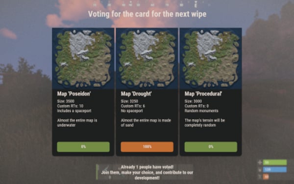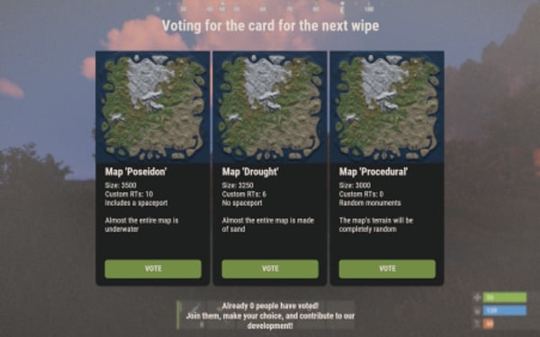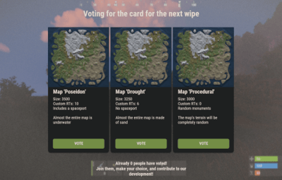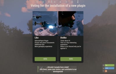 { "Chat command to open UI": "vote", "Configuration of supported plugins": { "IQChat: Chat notification settings": { "IQChat: Custom prefix in chat": "<color=#1F6BA0>[IQSimpleVote]</color>\n", "IQChat: Custom avatar in chat (if required)": "0" } }, "Discord settings": { "Webhook (Leave empty if you do not need results and notifications in Discord)": "https://discord.com/api/webhooks/1161367749281456250/kvwg6ArR-iZbQdrk-oxtKRUnC_5vYaMRMLMLmG3duWgnOFvFeEkCmjkrNBYySLDWDRob", "Configuration of Discord message formatting for vote start": { "Title": "A new vote has started!", "Description (do not delete {0})": "Join the server and vote using the command {0}", "Additional text in the footer": "Every vote counts! Join in and participate!", "Message (e.g., you can use @everyone)": "@everyone", "Message color": 7572805, "Author's name": "Voting", "Author's avatar": "https://i.postimg.cc/pX1XBcZf/vote.png", "Additional image": "https://i.postimg.cc/pX1XBcZf/vote.png" }, "Configuration of Discord message formatting for vote end": { "Title": "Voting has ended", "Description (do not delete {0})": "Voting results: \n{0}", "Additional text in the footer": "Thank you for participating", "Message (e.g., you can use @everyone)": "", "Message color": 13451563, "Author's name": "Voting", "Author's avatar": "https://i.postimg.cc/8kfSSkB6/stats.png", "Additional image": "https://i.postimg.cc/8kfSSkB6/stats.png" } }, "Interface settings": { "Text color": "0.8941177 0.854902 0.8196079 1", "Background color": "0.8941177 0.854902 0.8196079 0.3", "Color of the button for the option voted by the player": "0.7607843 0.427451 0.2 1", "Color of the buttons for options not voted by the player": "0.4509804 0.5529412 0.2705882 1" }, "List of votes [UniqueKey] - Settings": { "map": { "Title for voting in different languages [LanguageKey] = Text": { "ru": "", "en": "Voting for the card for the next wipe" }, "List of voting options (Must be at least 2)": [ { "Image for the voting option (Upload to ..data/IQSystem/IQSimpleVote/Images)": "EXAMPLE_VOTE_MAP_ICON", "Title for the option in different languages [LanguageKey] = Text": { "ru": "", "en": "Map 'Poseidon'" }, "Description for the option in different languages [LanguageKey] = Text": { "ru": "", "en": "Size: 3500\nCustom RTs: 10\nIncludes a spaceport\n\nAlmost the entire map is underwater" } }, { "Image for the voting option (Upload to ..data/IQSystem/IQSimpleVote/Images)": "EXAMPLE_VOTE_MAP_ICON", "Title for the option in different languages [LanguageKey] = Text": { "ru": "", "en": "Map 'Drought'" }, "Description for the option in different languages [LanguageKey] = Text": { "ru": "", "en": "Size: 3250\nCustom RTs: 6\nNo spaceport\n\nAlmost the entire map is made of sand" } }, { "Image for the voting option (Upload to ..data/IQSystem/IQSimpleVote/Images)": "EXAMPLE_VOTE_MAP_ICON", "Title for the option in different languages [LanguageKey] = Text": { "ru": "", "en": "Map 'Procedural'" }, "Description for the option in different languages [LanguageKey] = Text": { "ru": "", "en": "Size: 3000\nCustom RTs: 0\nRandom monuments\n\nThe map's terrain will be completely random" } } ] }, "drone": { "Title for voting in different languages [LanguageKey] = Text": { "ru": "", "en": "Voting for the installation of a new plugin" }, "List of voting options (Must be at least 2)": [ { "Image for the voting option (Upload to ..data/IQSystem/IQSimpleVote/Images)": "DRONE_YES", "Title for the option in different languages [LanguageKey] = Text": { "ru": "", "en": "Like" }, "Description for the option in different languages [LanguageKey] = Text": { "ru": "", "en": "IQDronePatrol Plugin\nDrones will patrol monuments\nAdditional loot\nMore gameplay experience" } }, { "Image for the voting option (Upload to ..data/IQSystem/IQSimpleVote/Images)": "DRONE_NO", "Title for the option in different languages [LanguageKey] = Text": { "ru": "", "en": "Dislike" }, "Description for the option in different languages [LanguageKey] = Text": { "ru": "", "en": "Think About It!\nThis is a very interesting experience.\nShare in our Discord why you’re against it." } } ] } } }
