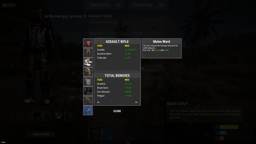Name: Prospector Description: This perk increases your mining yield when mining stone, metal and sulfur nodes. Name: Lumberjack Description: This perk increases your woodcutting yield when chopping living or dead trees. Name: Butcher Description: This perk increases the resources gained from skinning humans and animals. Name: Horticulture Description: This perk increases the amount of resources gained when harvesting grown plants. Name: Forager Description: This perk increases the amount of resources gained when picking up map generated collectibles. Name: Angler Description: This perk increases the amount of fish you receive upon a successful catch. Name: BeastBane Description: This perk increases the damage dealt to animals. Name: ScientistBane Description: This perk increases the damage dealt to scientists. Name: FlakJacket Description: This perk reduces the damage received from explosions. Name: Elemental Description: This perk reduces damage from received from cold and heat sources. Name: Scavenger Description: This perk provides you with a chance to find additional scrap from crates and barrels. Name: Manufacture Description: This perk increases the speed of your crafting. Name: Durable Description: This peark reduces the durability damage of all equipped items. Name: BeastWard Description: This perk reduces the damage received from animals. Name: ScientistWard Description: This perk reduces the damage received from scientists. Name: Builder Description: This perk provides you with a chance for your building upgrades to be free. Name: Thrifty Description: This perk provides you with a chance for your crafting components to be refunded upon a successful craft. Name: Fabricate Description: This perk provides you with a chance to duplicate an item upon a successful craft. Name: Pharmaceutical Description: This perk increases the amount of healing received from all sources. Name: MeleeWard Description: This perk reduces the damage received from melee weapons. Name: Academic Description: This perk provides you with a chance to receive a scrap refund when researching an item at the research bench. Name: FallDamage Description: This perk reduces the impact damage received from falling. Name: Lead Description: This perk reduces the damage from radiation. Name: Smasher Description: This perk will provide you with a chance to instantly destroy barrels with any amount of damage. Name: Environmentalist Description: This perk will increase the speed of recyclers that you activate. Name: Smelter Description: This perk will increase the smelting speed of furnaces you activate. Name: Paramedic Description: This perk provides players that you revive with additional health. Name: Prepper Description: This perk provides you with a chance to not consume food when eating. Name: Regeneration Description: This perk will passively regenerate you. Name: SharkWard Description: This perk will reduce the amount of damage received from sharks. Name: SharkBane Description: This perk will increase the amount of damage dealt to sharks. Name: Deforest Description: This perk provides you with a chance to cut down nearby trees when successfully cutting a tree down. Name: BlastMine Description: This perk provides you with a chance to mine out nearby nodes when successfully mining out a node. Name: Tanner Description: This perk provides you with a chance to skin nearby corpses when successfully skinning out a corpse. Name: Vampiric Description: This perk will heal you for a percentage of the damage dealt to certain enemies. Name: Reinforced Description: This perk will reduce the the amount of damage that your vehicles receive when mounted. Name: ComponentLuck Description: This perk will provide you with a chance to receive additional components when looting barrels and crates. Name: ElectronicsLuck Description: This perk will provide you with a chance to receive additional electronics when looting barrels and crates. Name: UncannyDodge Description: This perk provides you with a chance to dodge incoming damage, reducing it to 0. Name: LineStrength Description: This perk increases the tensile strength of your fishing line. Name: HealShare Description: This perk will share healing effects with nearby players. Name: Attractive Description: This perk will provide you with a chance to automatically pick up components when destroying barrels. Name: WoodcuttingLuck Description: This perk provides you with a chance to find a random item when you cut down a tree. Name: MiningLuck Description: This perk provides you with a chance to find a random item when you mine out a node. Name: SkinningLuck Description: This perk provides you with a chance to find a random item when you skin out a corpse. Name: FishingLuck Description: This perk provides you with a chance to find a random item when you catch a fish. Name: Sated Description: This perk will increase the amount of calories and hydration you receive from food and water sources. Name: IronStomach Description: This perk provides you with a chance to negate negative effects when consuming food. Name: TreePlanter Description: This perk will provide a chance for a tree to instantly regrow when cut down. Name: RockCycler Description: This perk will provide a chance for a node to instantly respawn when mined out. Name: BradleyDamage Description: This perk increases the damage dealt to Bradley Tanks. Name: HeliDamage Description: This perk increases the damage dealt to Patrol Helicopters. Name: Thorns Description: This perk reflects a % of the damage done back to the attacker