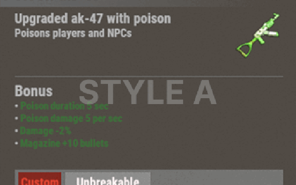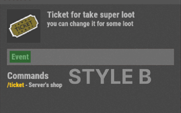 { "Lootable containers for scaning, use only containers without block(grey) slots and and where the number of slots is a multiple of 6 (6, 12, 18, 24)": { "coffinstorage": 48, "box.wooden.large": 48, "woodbox_deployed": 18, "storage_barrel_b": 48, "storage_barrel_c": 48, "fridge.deployed": 48, "dropbox.deployed": 12, "small_stash_deployed": 6 }, "All items menu command": "items", "Permission to open UI with all items": "itemsinfo.items", "Interface style": "StyleB", "Items info settings (key - skinId)": { "2365330645": { "Item name": "Gather gloves", "Search item by skinId(false) or ItemId(true)": false, "Item description": [ "<size=18>Gloves up your gather</size>", "You need to put this on" ], "Item info": [ "<size=20>Bonus</size>", "• <color=#387338>Stones +50%</color>", "• <color=#387338>Metal +30%</color>", "• <color=#387338>Sulfur +20%</color>" ], "Item tags": [ 3, 4 ] }, "2852472024": { "Item name": "Ticket", "Search item by skinId(false) or ItemId(true)": false, "Item description": [ "<size=18>Ticket for take super loot</size>", "you can change it for some loot" ], "Item info": [ "<size=20>Commands</size>", "<color=#FFCC00>/ticket</color> - Server's shop" ], "Item tags": [ 1 ] }, "3000086667": { "Item name": "Kibble", "Search item by skinId(false) or ItemId(true)": false, "Item description": [ "<size=18>Kibble for animals</size>", "Find wild animal and drop near" ], "Item info": [ "<size=20>Effects</size>", "• Tame animal", "• Kill and gather x10" ], "Item tags": [ 1, 2 ] } }, "Tags settings": [ { "Tag size": 45.0, "Tag color": "#34753B", "Tag text": "Event", "Tag text color": "#6FAC76", "Tag id": 1 }, { "Tag size": 65.0, "Tag color": "#1C34AC", "Tag text": "Economy", "Tag text color": "#57A2F9", "Tag id": 2 }, { "Tag size": 55.0, "Tag color": "#932214", "Tag text": "Custom", "Tag text color": "#E44530", "Tag id": 3 }, { "Tag size": 110.0, "Tag color": "#9D9D9D", "Tag text": "Unbreakable", "Tag text color": "#FFF4F4", "Tag id": 4 } ], "UI settings": { "Inventory Image Icon": "https://i.ibb.co/TMxWBHJ2/scan.png", "Image for scan item": "https://i.ibb.co/zVwhtYGS/search.png", "Button ? settings": { "AnchorMin": "0.5 0", "AnchorMax": "0.5 0", "OffsetMin": "189 18", "OffsetMax": "249 78" } }, "Config version": { "Major": 1, "Minor": 1, "Patch": 0 } }