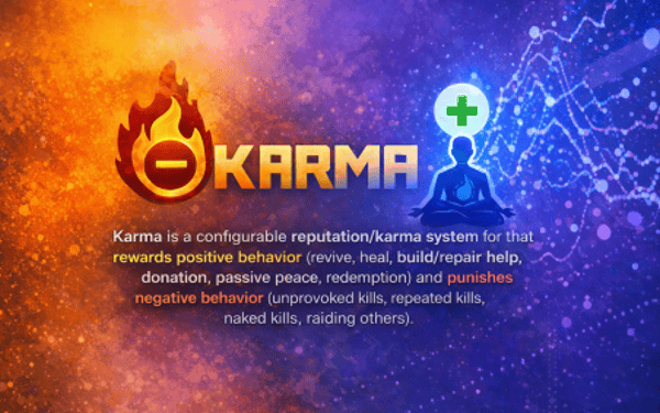 Karma is a configurable reputation/karma system for that rewards positive behavior (revive, heal, build/repair help, donation, passive peace, redemption) and punishes negative behavior (unprovoked kills, repeated kills, naked kills, raiding others).