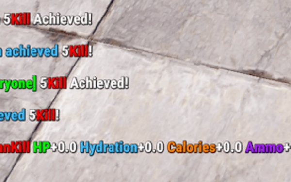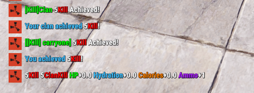 { "KillReward": "{0}<color=red>Kill</color> {1} {2} {3} {4}", "KillRewardWithClan": "{0}<color=red>Kill</color> {1}<color=red>ClanKill</color> {2} {3} {4} {5}", "HPRecovery": "<color=green>HP</color>+{0} ", "ThirstRecovery": "<color=#45BCFF>Hydration</color>+{0} ", "HungerRecovery": "<color=orange>Calories</color>+{0} ", "AmmoRefill": "<color=purple>Ammo</color>+{0} ", "Achieved": "<color=#45BCFF>You achieved</color> {0}<color=red>Kill</color>!", "ClanAchieved": "<color=#45BCFF>Your clan achieved</color> {0}<color=red>Kill</color>!", "anounceAchieved": "<color=green>[{0}]</color> {1}<color=red>Kill</color> Achieved!", "anounceClanAchieved": "<color=green>[{0}]Clan</color> {1}<color=red>Kill</color> Achieved!", "EveryXkill": "<color=#FF009B>Every</color> {0}<color=red>Kill Bonus</color>!", "ClanEveryXkill": "<color=#FF009B>Every</color> {0}<color=red>ClanKill Bonus</color>!", "UsagePlayerAmount": "Usage: /kb addpk or /kb removepk <playerNameOrId> <amount>", "AmountMustBeInteger": "Amount must be an integer.", "PlayerKillsAdded": "Player kills has been added.", "PlayerKillsRemoved": "Player kills has been removed.", "KillDataReset": "Player Kill data has been reset.", "ClanKillDataReset": "Clan kill data has been reset.", "AllDataReset": "All data has been reset.", "PlayerAchievementAdded": "Player achievement has been added.", "PlayerAchievementRemoved": "Player achievement has been removed.", "ClanKillsAdded": "Clan kills have been added.", "ClanKillsRemoved": "Clan kills have been removed.", "ClanAchievementAdded": "Clan achievement has been added.", "ClanAchievementRemoved": "Clan achievement has been removed.", "Amountpositivenumber": "Amount must be an positive number.", "InvalidKbCommand": "Invalid command. Usage: /kb(kb) <command> <target> <amount>", "FailedCommand": "Failed command.", "InvalidResetCommand": "Invalid command. Usage: /kbreset | kbreset <player | clan>", "Noperm": "You don't have permission to do this." }