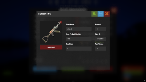 - Support for blueprints, custom skin IDs, and drop probabilities.