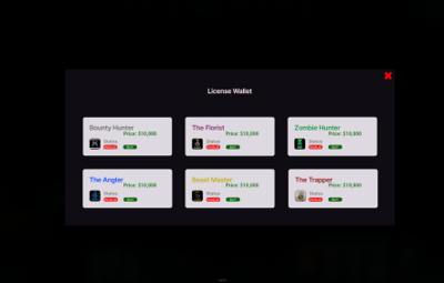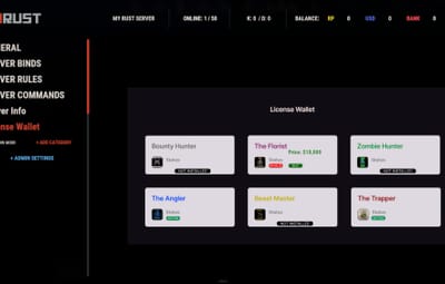 { "Wallet Skin ID": 3321288892, "Show Not Installed Buttons When Missing A Dependency?": true, "Add Buy Button Where Available?": true, "Console Command In Bounty Hunter Plugin? (BE SURE TO LEAVE A SPACE AFTER THE COMMAND FOR PLAYER ID TO PARSE) Ex: buybl ": "buybl ", "Bounty License Price From Your Bounty Hunter Config": "<color=green>Price: $10,000</color>", "Console Command In The Florist Plugin? (BE SURE TO LEAVE A SPACE AFTER THE COMMAND FOR PLAYER ID TO PARSE) Ex: buyfg ": "buyfg ", "Florist Guide Price From Your Florist Config": "<color=green>Price: $10,000</color>", "Console Command In Zombie Hunter Plugin? (BE SURE TO LEAVE A SPACE AFTER THE COMMAND FOR PLAYER ID TO PARSE) Ex: buyzl ": "buyzl ", "Zombie License Price From Your Zombie Hunter Config": "<color=green>Price: $10,000</color>", "Console Command In The Angler Plugin? (BE SURE TO LEAVE A SPACE AFTER THE COMMAND FOR PLAYER ID TO PARSE) Ex: buyal ": "buyal ", "Angler License Price From Your Angler Config": "<color=green>Price: $10,000</color>", "Console Command In The Trapper Plugin? (BE SURE TO LEAVE A SPACE AFTER THE COMMAND FOR PLAYER ID TO PARSE) Ex: buytl ": "buytl ", "Trapper License Price From Your Trapper Config": "<color=green>Price: $10,000</color>", "Console Command In Beast Master Plugin? (BE SURE TO LEAVE A SPACE AFTER THE COMMAND FOR PLAYER ID TO PARSE) Ex: buybml ": "buybml ", "Beast Master License Price From Your Beast Master Config": "<color=green>Price: $10,000</color>" }