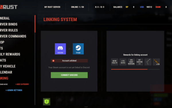 Introducing Linking System, the ultimate Discord integration plugin for your Rust server! Seamlessly connect your players Rust accounts with their Discord profiles, automatically assign roles, and reward linked players with exclusive perks. With a beautiful UI, complete Discord bot solution, and powerful automation features, Linking System is the perfect tool to enhance your community engagement and keep your Discord server active.