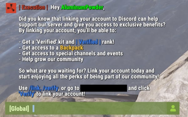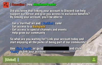 { "Steam Avatar User ID": 0, "Oxide Group Name": "default", "Message interval in seconds": 300.0, "Message to send to player (You can use \n for new line, <color=#11111></color>, and more tags": "Hey {player},Don't forget to link your account to Discord for access to exclusive benefits, such as a 'Verified' kit and rank,special channels and events, and the ability to help grow our community.Go to our website to verify your account today!" }