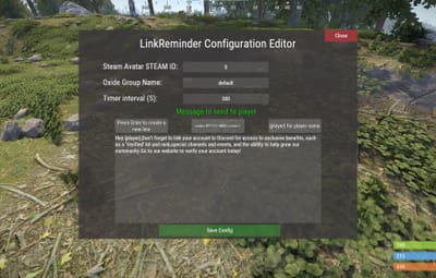 LinkReminder is a plugin that will automatically message any and every user that is not part of a specific oxide group every "x" amount of seconds. It is fully customizable, changing the Icon, message, colors, group names, etc.. All configurable through the Config file, or ingame by typing /linkconfig! (Permissions required for that comman, read below)