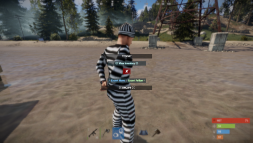 Lock Up the nasty players! Admins or players with permissions will have the ability to spawn handcuffs and use them to lock up victims or npc's while also giving them the ability to escort or loot their target. This system was heavily inspired by the Rustoria/OTV developers.
