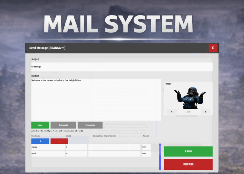 Mail System is an in-game mail and notification system for Rust servers, allowing players to send “emails” to online and offline players. Admins will also benefit from being able to include attachments such as items, commands, and economy rewards, and players can now open support tickets for staff assistance directly in-game.