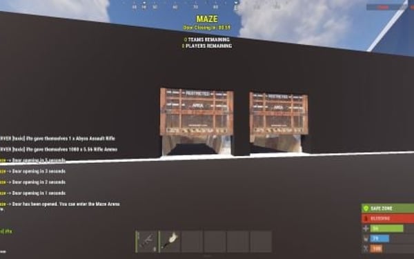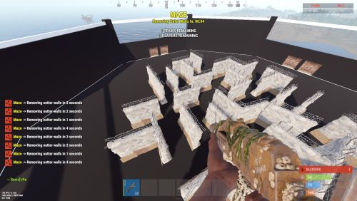 { "Maze Automatic Event": false, "Maze Automatic Event Interval Minimum (In Seconds)": 3600, "Maze Automatic Event Interval Maximum (In Seconds)": 7200, "Maze Minimum player requires to starts Auto": 2, "Maze Automatic Event Random From List": [ "mazeareana", "maze2areana" ], "Maze Event Player Teleport Timer (In Seconds)": 15, "Maze Event Before Notification (In Seconds)": 300, "Maze Event Door Opening Notification (In Seconds)": 300, "Maze Event Door Closing In (In Seconds)": 600, "Maze Event Removing Walls Radius": 10, "Maze Event Shrink Amount": 3, "Maze Event Removing Walls Timer (In Seconds)": 15, "Show Kill Streak Messages": true, "Maze Event Door Prefab": "assets/content/structures/interactive_garage_door/sliding_blast_door.prefab", "Maze Walls Item List": [ "assets/prefabs/building/wall.external.high.stone/wall.external.high.stone.prefab", "assets/prefabs/misc/xmas/icewalls/wall.external.high.ice.prefab", "assets/prefabs/misc/xmas/icewalls/icewall.prefab", "assets/prefabs/deployable/barricades/brarricade.cover.wood_double.prefab" ], "Maze Event Blocked items": [ "grenade.beancan", "grenade.f1", "rock", "rocket.launcher", "ammo.rocket.basic", "ammo.rocket.smoke", "ammo.rocket.hv", "ammo.rocket.seeker", "ammo.rocket.fire", "explosive.satchel", "explosive.timed", "ammo.grenadelauncher.smoke", "ammo.grenadelauncher.buckshot", "ammo.grenadelauncher.he", "grenade.flashbang", "grenade.molotov", "multiplegrenadelauncher", "grenade.smoke" ], "Maze Event Blocked Commands": [ "kit", "trade", "remove", "tpa", "home", "shop", "clan" ], "Maze Map Marker Setting": { "Display Name": "Maze", "Marker Radius": 0.4, "Marker Transparency": 0.75, "Marker Color": "#FFFF00" }, "Maze Rewards": { "Give commmands rewards upon winning the event": true, "Rewards player with higest kill from winning clan": true, "Rewards upon winning({PLAYER})": [ "inventory.giveto {PLAYER} supply.signal 1" ], "Spawn loot boxes in the arena": true, "Loot boxes time in seconds": 300 }, "Maze Chat Setting": { "Chat Avatar Icon": 0, "Chat Prefix": "<color=#FFFF00>Maze</color> -> ", "Winner Message": [ "<color=#FFD700>Maze Results:</color>", "\n", "Winner -> <color=#FFFF00>{WinningClanName}</color>", "", "{PlayerStats}", "", "<color=#FFD700>Totals:</color> Kills: {ClanTotalKills}, Deaths: {ClanTotalDeaths}, KDR: {ClanTotalKDR}", "Damage: {ClanTotalDamage}, Headshots: {ClanTotalHeadshots}", "", "<color=#FFD700>Aggregate Maze Totals:</color>", "- Total Kills: <color=#FFD700>{TotalKills}</color>", "- Total Damage: <color=#FFD700>{TotalDamages}</color>", "- Number of Participants: <color=#FFD700>{Participents}</color>" ], "Participents Message": [ "<color=#FFD700>Personal Stats</color>", "Kills: <color=#FFD700>{Kills}</color>, Deaths: <color=#FFD700>{Deaths}</color>, KDR: <color=#FFD700>{KDR}</color>, Total Damage: <color=#FFD700>{Damages}</color>, HeadShots: <color=#FFD700>{Headshots}</color>", "Shooting Accuracy: <color=#FFD700>{Accuracy}%</color>, HeadShot Accuracy: <color=#FFD700>{HeadshotAccuracy}%</color>" ], "Maze Event Top Bar Message": [ "<size=25><color=#FFFF00><b>MAZE</b></color></size>", "<size=15><color=#FFFF00><b>{DYNAMIC_TIMER}</b></color></size>", "", "<size=15><color=#FFFF00>{TotalTeams}</color><b> TEAMS REMAINING</b></size>", "<size=15><color=#FFFF00>{TotalPlayers}</color><b> PLAYERS REMAINING</b></size>" ] }, "Discord Setting": { "Enable Discord Webhook": false, "Discord Webhook URL": "", "Discord Webhook Message": [ "**MAZE ARENA**", "", "**Details**", "Total Kills: `{TotalKills}`", "Total Teams: `{TotalTeams}`", "Total Players: `{Participents}`", "", "**Winners**", "**{WinnerClanName}**", " Kills: `{ClanKills}` Deaths: `{ClanDeaths}`", " Headshots: `{ClanHeadshots}` Damages: `{ClanDamages}`", "", "**Members**", "{MembersStats}" ] }, "Auto Maze Arena Setup": { "Start Maze Arena Setup": true, "Auto Arena Setup": { "AutoMaze1": { "Maze Center Item": "skullspikes.candles", "Maze Arena Locate Radius": 100.0, "Maze Arena Wall Radius": 40.0, "Maze Arena Mesh Top & Bottom Height": 50.0, "Maze Spawn Points Item": "woodbox_deployed", "Maze Door Item": "workbench1.deployed", "Maze Corner Item": "mailbox" } } } }