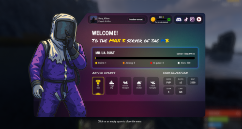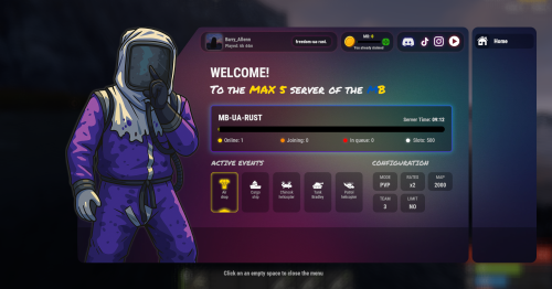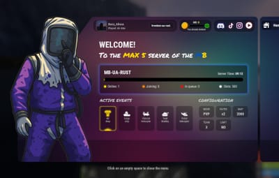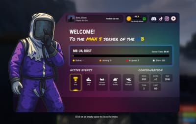 { "Multilingual welcome text for the second block. Configure the text for each language separately.": { "en": { "Enabled": true, "Text": "To the <color=#FFD700>MAX 5</color> server of the <color=#0057B7>M</color><color=#FFD700>B</color> project" }, "ru": { "Enabled": true, "Text": "На сервер <color=#FFD700>MAX 5</color> проекта <color=#0057B7>M</color><color=#FFD700>B</color>" }, "uk": { "Enabled": true, "Text": "На сервер <color=#FFD700>MAX 5</color> проекту <color=#0057B7>M</color><color=#FFD700>B</color>" } }, "Server Name": "Rust", "Website Link": "", "QR Code to Website": "https://i.ibb.co/8LcDd6bp/free-png-ru-38.png", "Discord Link": "", "QR Code на Discord": "https://i.ibb.co/8LcDd6bp/free-png-ru-38.png", "TikTok Link": "", "QR Code на TikTok": "https://i.ibb.co/8LcDd6bp/free-png-ru-38.png", "Instagram Link": "", "QR Code на Instagram": "https://i.ibb.co/8LcDd6bp/free-png-ru-38.png", "YouTube Link": "", "QR Code на YouTube": "https://i.ibb.co/8LcDd6bp/free-png-ru-38.png", "Maximum number of players on the server (limit)": "NO", "Game mode (e.g. Solo, Duo, Trio, PvE, etc.)": "PVP", "Team limits (for example: 2, 3, 5, 10, 20, 32)": "5", "Server rates (eg: x2, x5, x10)": "x2", "First Join Reward Amount": 5, "Online reward interval (minutes)": 360, "Online reward amount": 1, "Balance label": "MB:", "NPC Image URL": "https://i.ibb.co/r2Ft9sJQ/MBNPC.png", "Economy System Type (Economics, ServerRewards, MBCoins)": "MBCoins", "Maximum balance for filling the bar": 500.0 }