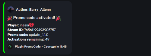 { "EnablePromoCodeBroadcast": true, "MessagePrefix": "<color=#0057b8>[Promo]</color>", "PromoCodes": { "WELCOME": { "Reward": "give {player} wood 1000", "Expires": "30.10.2025", "MaxUses": 50 }, "BONUS": { "Reward": "give {player} stone 500", "Expires": "01.11.2025", "MaxUses": 100 } } }
