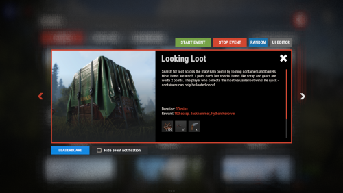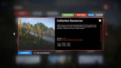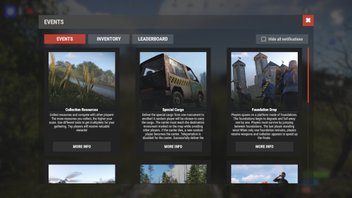 - Pre-loaded with diverse events such as CollectionResources, FoundationDrop, HelicopterPet, HuntAnimal, KingOfHill, LookingLoot, and SpecialCargo, each offering unique gameplay experiences.
