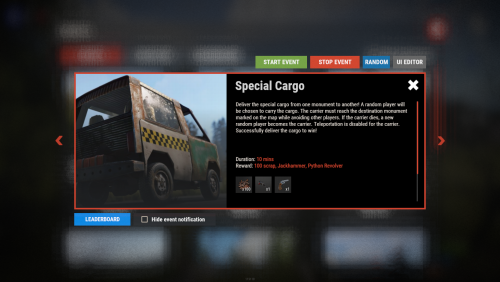 - SpecialCargo - Deliver the special cargo from one monument to another! A random player will be chosen to carry the cargo. The carrier must reach the destination monument marked on the map while avoiding other players. If the carrier dies, a new random player becomes the carrier. Teleportation is disabled for the carrier. Successfully deliver the cargo to win!